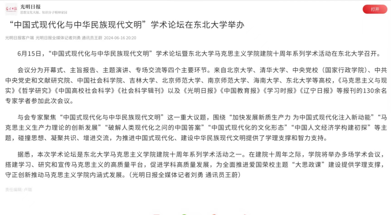 6月15日,“中国式现代化与中华民族现代文明”学术论坛暨成人抖音 建院十周年系列学术活动在东北大学国际学术交流中心召开。本次活动由东北大学主办,成人抖音 、辽宁省马克思主义学会、东北大学中国式现代化研究院、教育部大中小学思政课一体化共同体(辽宁)、全国高校思想政治理论课田鹏颖教授名师工作室、辽宁省高等学校新型智库(东北大学高校思想政治教育改革创新研究院)承办,旨在搭建学习、研究和宣传马克思主义的高质量平台,促进学科高质量发展,为全面推进爱国荣校主题“大思政课”建设提供学理支撑,守正创新推动成人抖音内涵式发展。