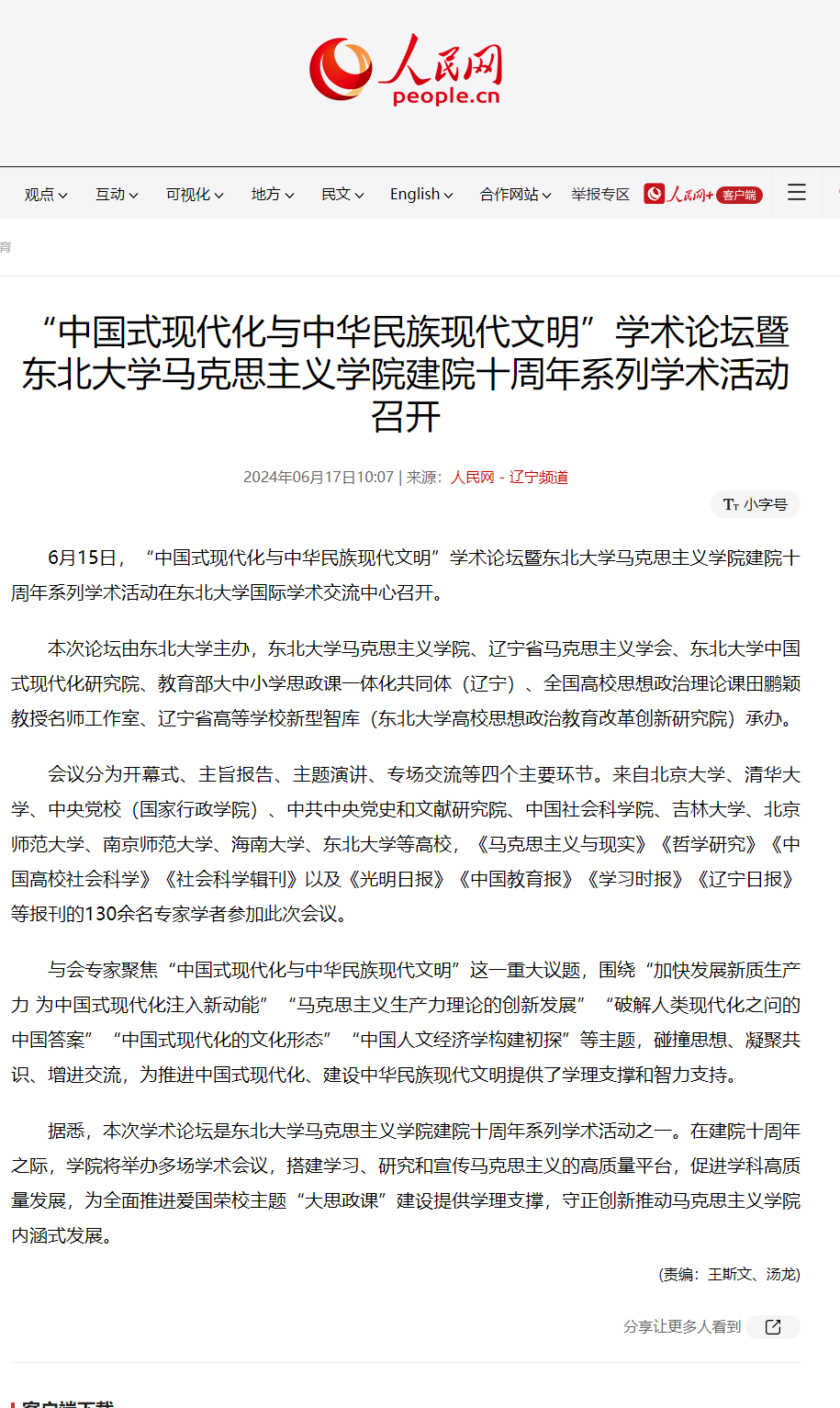 6月15日,“中国式现代化与中华民族现代文明”学术论坛暨成人抖音 建院十周年系列学术活动在东北大学国际学术交流中心召开。