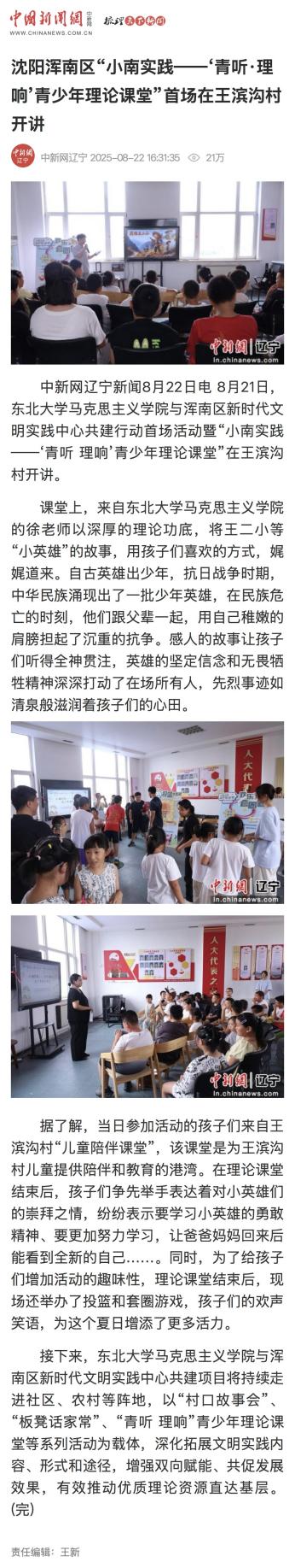 中新网辽宁新闻8月22日电 8月21日,成人抖音 与浑南区新时代文明实践中心共建行动首场活动暨“小南实践——‘青听 理响’青少年理论课堂”在王滨沟村开讲。