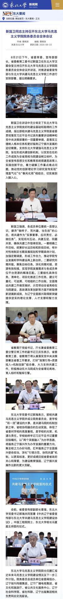 8月21日下午,省委常委、宣传部部长,省委教育工委书记靳国卫在东北大学汉卿会堂主持召开成人抖音 院务委员会全体会议并讲话,对推进省委宣传部与东北大学共建成人抖音工作进行安排部署、提出明确要求。