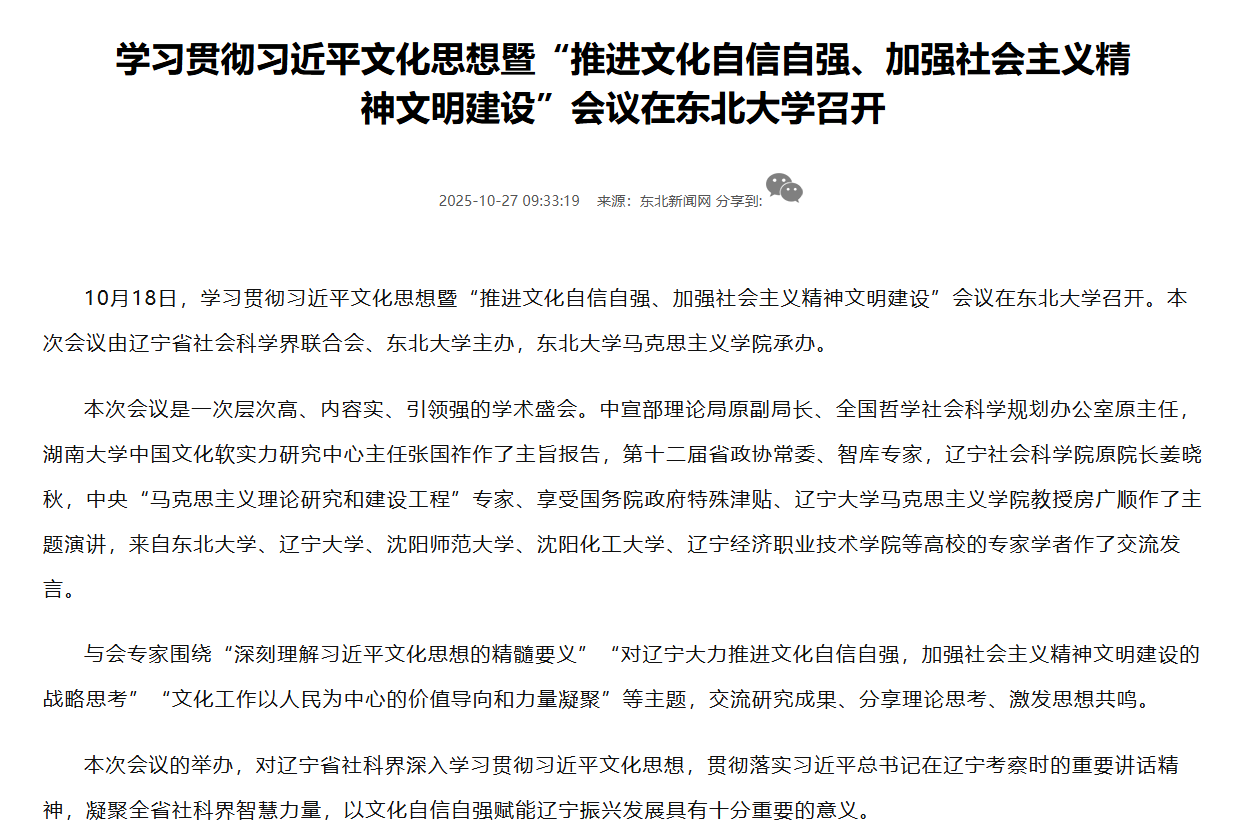 10月18日,学习贯彻习近平文化思想暨“推进文化自信自强、加强社会主义精神文明建设”会议在东北大学召开。本次会议由辽宁省社会科学界联合会、东北大学主办,成人抖音 承办。